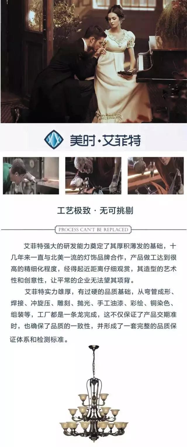 成立于2001年的艾菲特灯饰,一开始是外销型企业,服务的主要客户是Murray Feiss 、Kitcher Lighting等美国最高端的灯饰品牌。在合作过程中,艾菲特不仅学习到国外企业高标准的质量管理体系,也接触到大量的国际顶尖灯饰设计师,并且与他们建立了良好的合作关系。